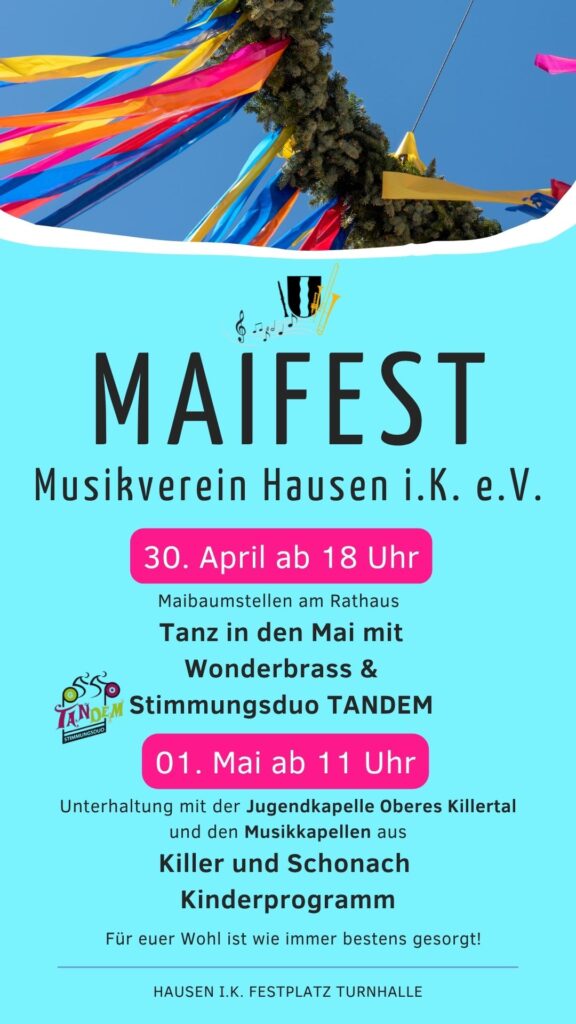 Unser Maifest erfreut sich großer Beliebtheit. Am 30. April mit der musikalischen Umrahmung des Maibaumstellens der FFW Abt. Hausen i.K., anschließend Tanz in den Mai mit Barbetrieb und am 01. Mai Mittagstisch mit der Jugenkapelle und anschließendem musikalischem Ausklang.